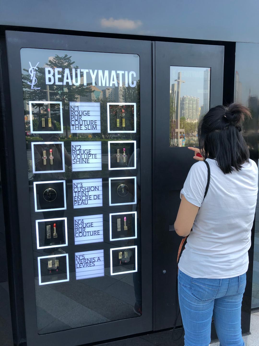 刚说完,她就尝试了门口右侧嵌入在黑色背景墙的无人贩卖机,据称是YSL美妆全球首个24小时的无人贩卖机,主要售卖小金条、方管、圆管口红的明星色号,以及气垫等爆款产品。