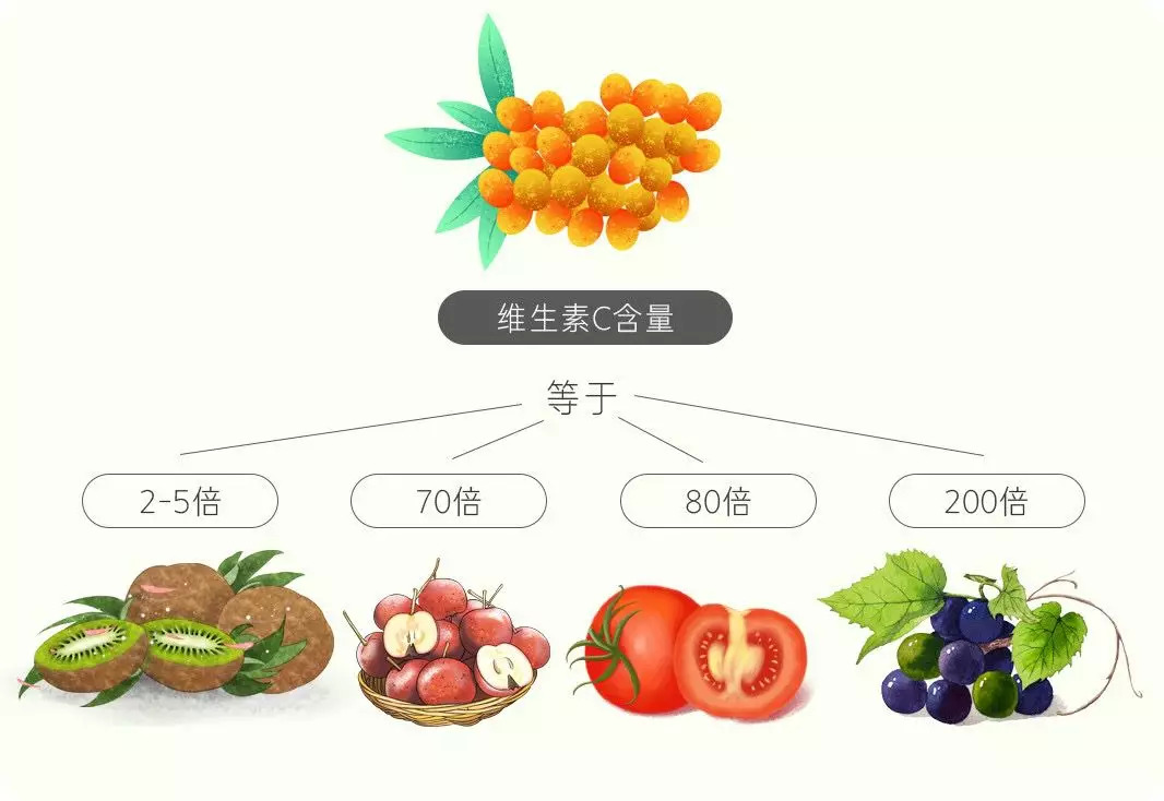 此外,沙棘富含维生素C、维生素A、维生素E、维生素B1、B2、B12、维生素K、叶酸(维生素B9)等15种维生素。同时沙棘还是目前世界上含有天然维生素种类最多的珍贵经济林树种,其维生素C的含量远远高于鲜枣和猕猴桃,从而被誉为天然维生素的宝库。