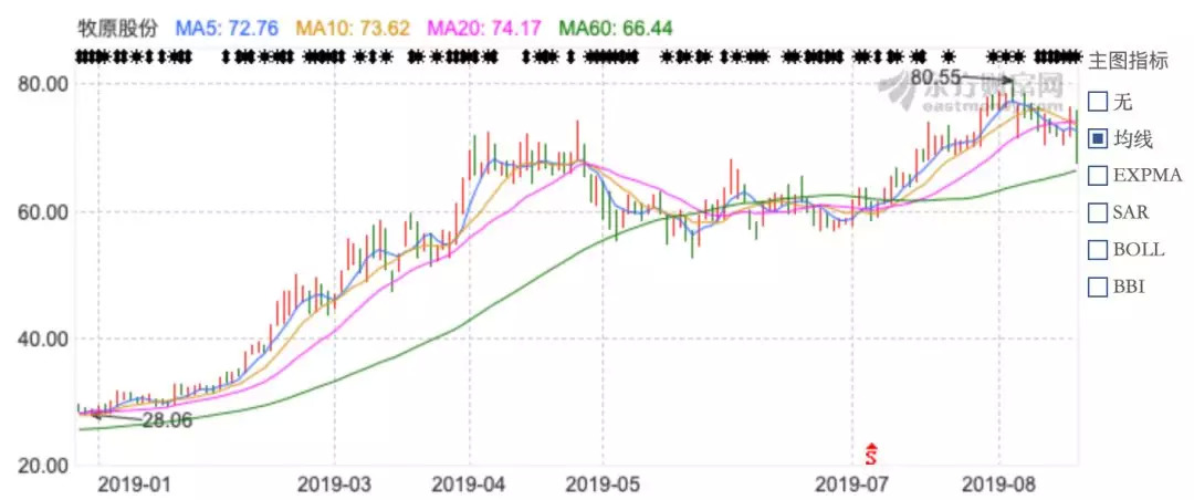 小幅回落后,再次持续上涨,整个7月,牧原股份上涨近30%,至8月5日盘中最高80.55元/股。