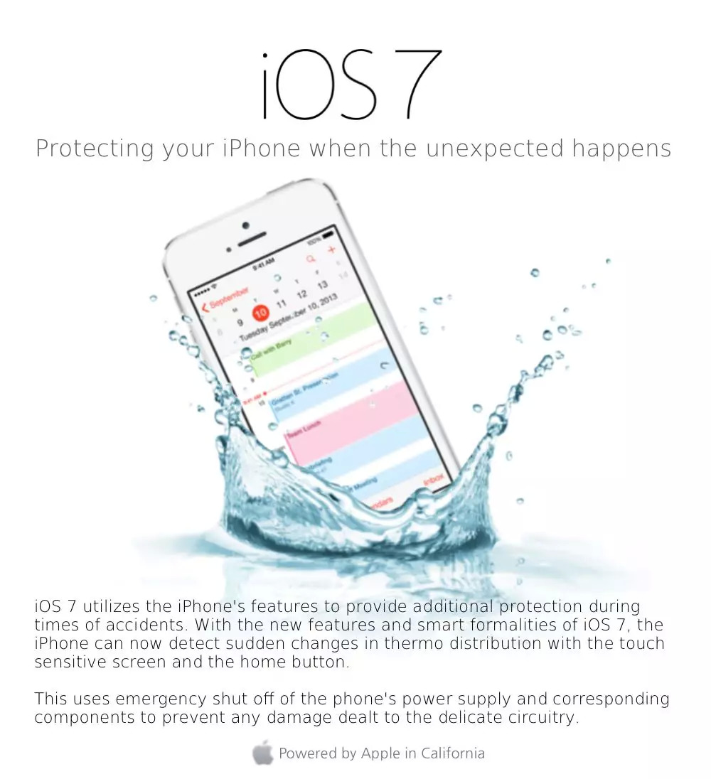 宣传图上说,升级到 iOS 7 之后,更先进的算法会让你的iPhone拥有防水的能力:当手机侦测到有水时,会自动断开电路与电池的连接。