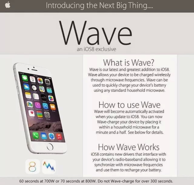 这次玩的可狠多了,宣传图上说通过新 iOS 更更更先进的算法,手机中用来接收无线信号的 RF 收发器可以吸收微波,并且把能量变成电量存进电池。只要把 iPhone 放到微波炉里,设定高功率,转上两分钟, 电就充满啦~