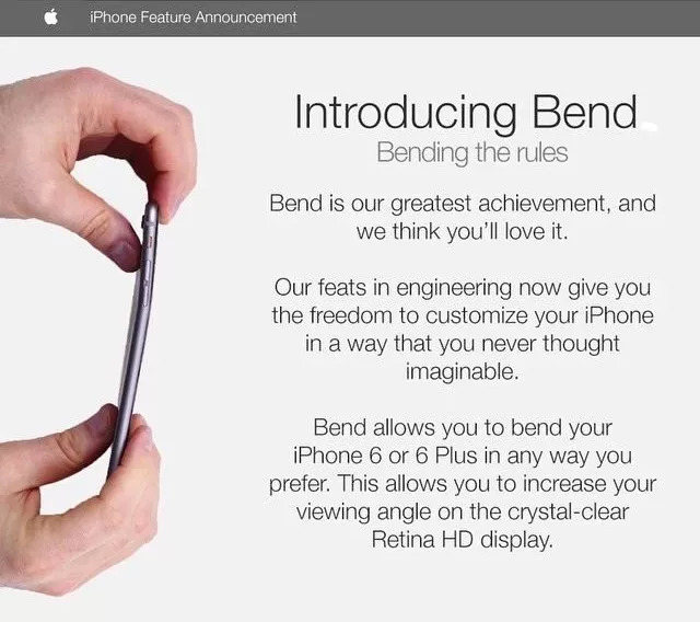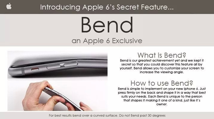 他们假借苹果的名义,说这种弯曲根本不是什么缺陷,而是特地的设计:iPhone6的机身可以在6°的范围内自由弯曲,所以你可以“涌有 ”你中意的手机形状。