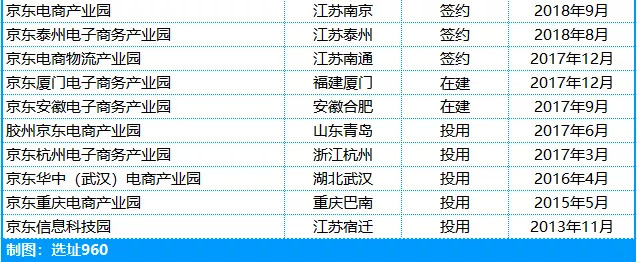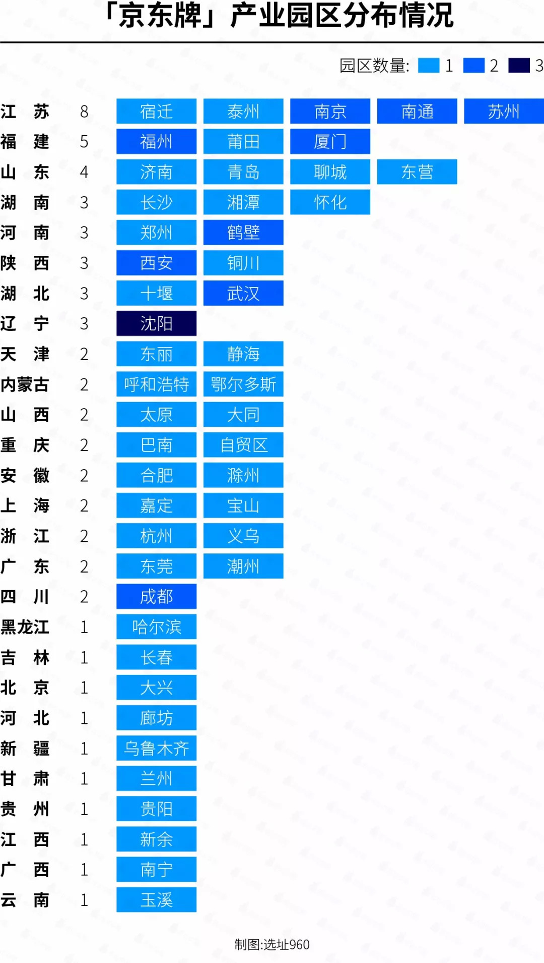 选址960不完全统计发现,目前,「京东牌」产业园数量已经超过60座、覆盖47座城市。