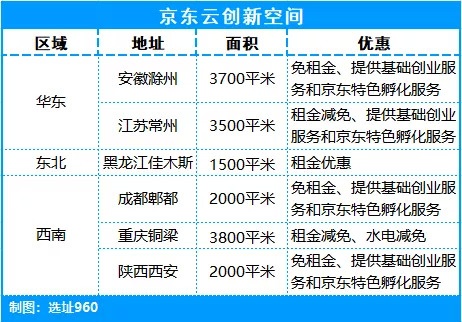 从覆盖城市来看,与产业园选址异曲同工,看中低线城市。目前,京东云创新空间已在滁州、常州、成都、重庆、西安、佳木斯等6个城市设立1000平方米至4000平方米的孵化空间。湘潭、肇庆、鄂尔多斯等地正在筹划中。
