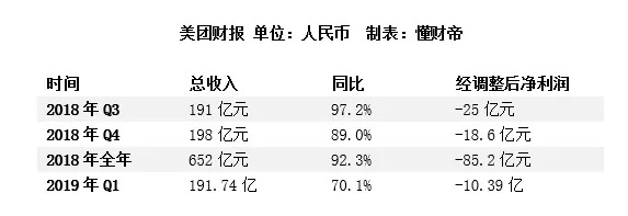 反观美团,虽然在市场占有率上仍保持着领先优势,但正是不断的战略扩张让美团陷入了“业务摊大饼”的困境。从从2018年Q3到2019年Q2,美团每季度仍亏损数十亿元。