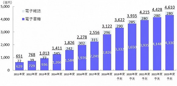2018年度的日本电子书市场规模达到了2826亿日元,同比增长了26.1%。而电子杂志市场规模则为296亿日元,同比减少了6%,这是电子杂志市场首次缩减规模。电子书和电子杂志合并组成的电子出版市场达到了3122亿日元,首次突破了3000亿日元大关。根据IMPRESS的预测,2019年度以后的日本电子出版市场将继续扩大,到2023年电子书市场将达到4330亿日元,为18年的1.5倍。而电子出版市场在2023年将可能达到4610亿日元。