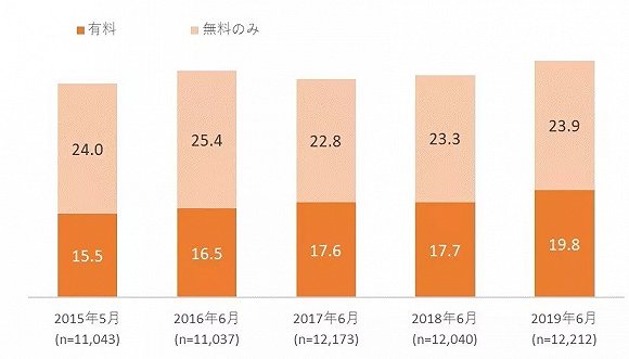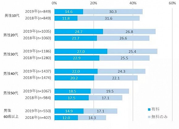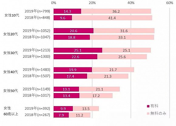 (注:“代”为年龄段的意思,如20代指的是20至29岁。“有料”为“付费”,“無料のみ”为“仅免费”)