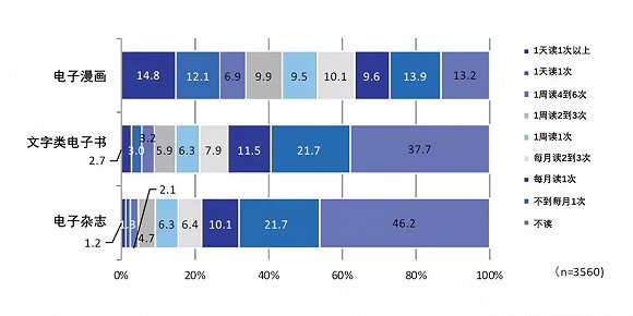 而文字类电子书和电子杂志由于免费阅读的内容十分有限,所以阅读频度不如电子漫画的高。