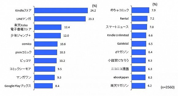 亚马逊的“Kindle Store”占比最高,达24.2%。其次是23.3%的“LINE Manga”,排在第3的是占比12.4%的“乐天Kobo电子书商店”,排在第4的是占比12%的“少年JUMP+”,排在第5的是占比10.6%的“comico”。