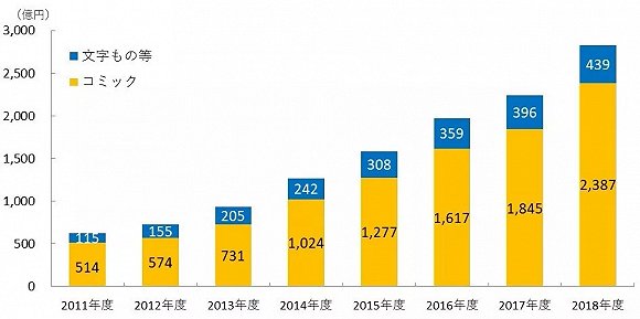 自2011下半年开始,电子漫画作品就开始逐渐增多,如今基本上绝大多数的纸质漫画单行本都被电子书化了。此外,纸质单行本和电子单行本同时发售也变得十分普遍。可以发现,电子漫画的增速十分显著,它给电子出版市场带来了巨大的贡献。