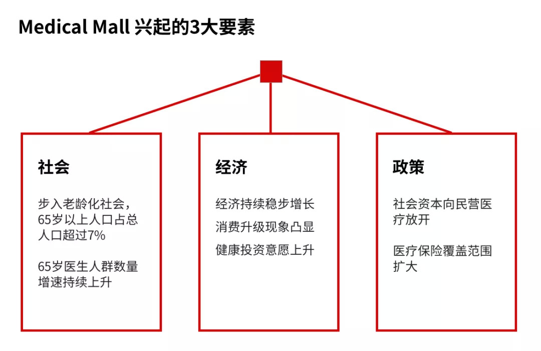 总体来看,Medical Mall 的兴起离不开一个国家的人口年龄结构激发的医疗需求、经济发展状况赋予的医疗消费力、以及政策引导下健康医疗产业的市场化发展。