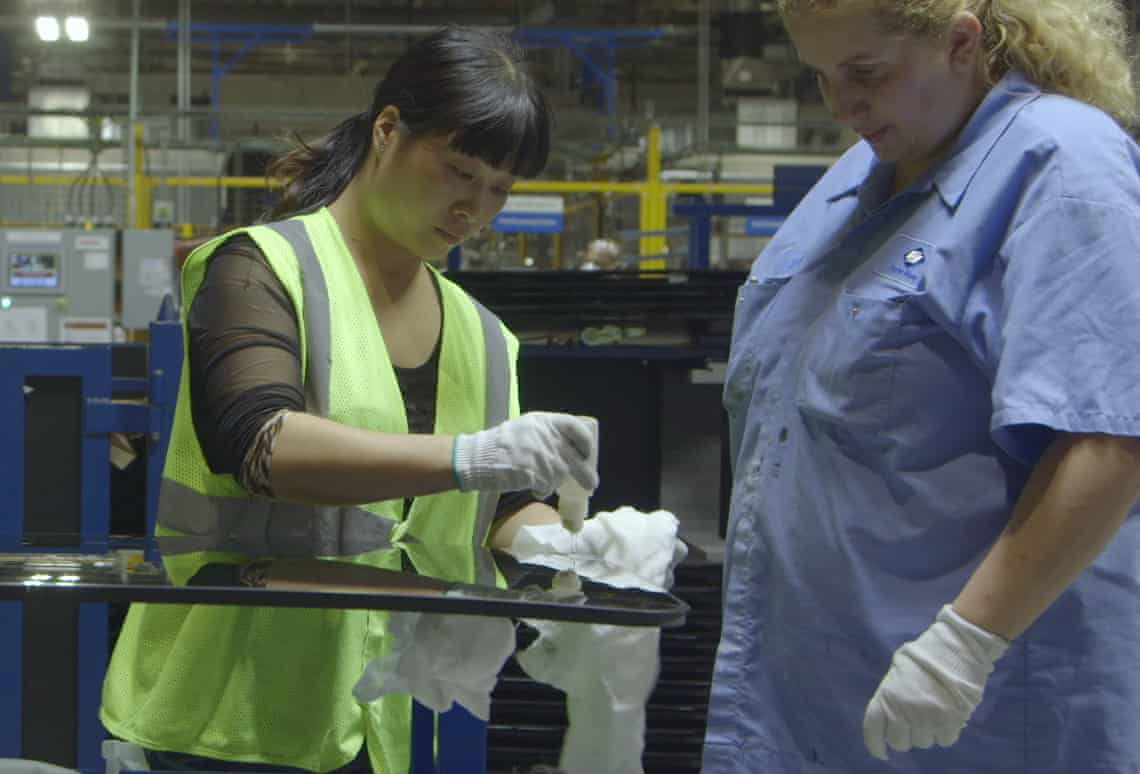 到了2014年,来自中国的福耀老板曹德旺将其变成世界上最大的汽车玻璃制造单体工厂,并雇佣了2000多名美国当地员工。于是,莱切特和博格纳这对导演夫妇又打开了摄像机,花费三年时间拍摄福耀美国工厂在当地的故事。
