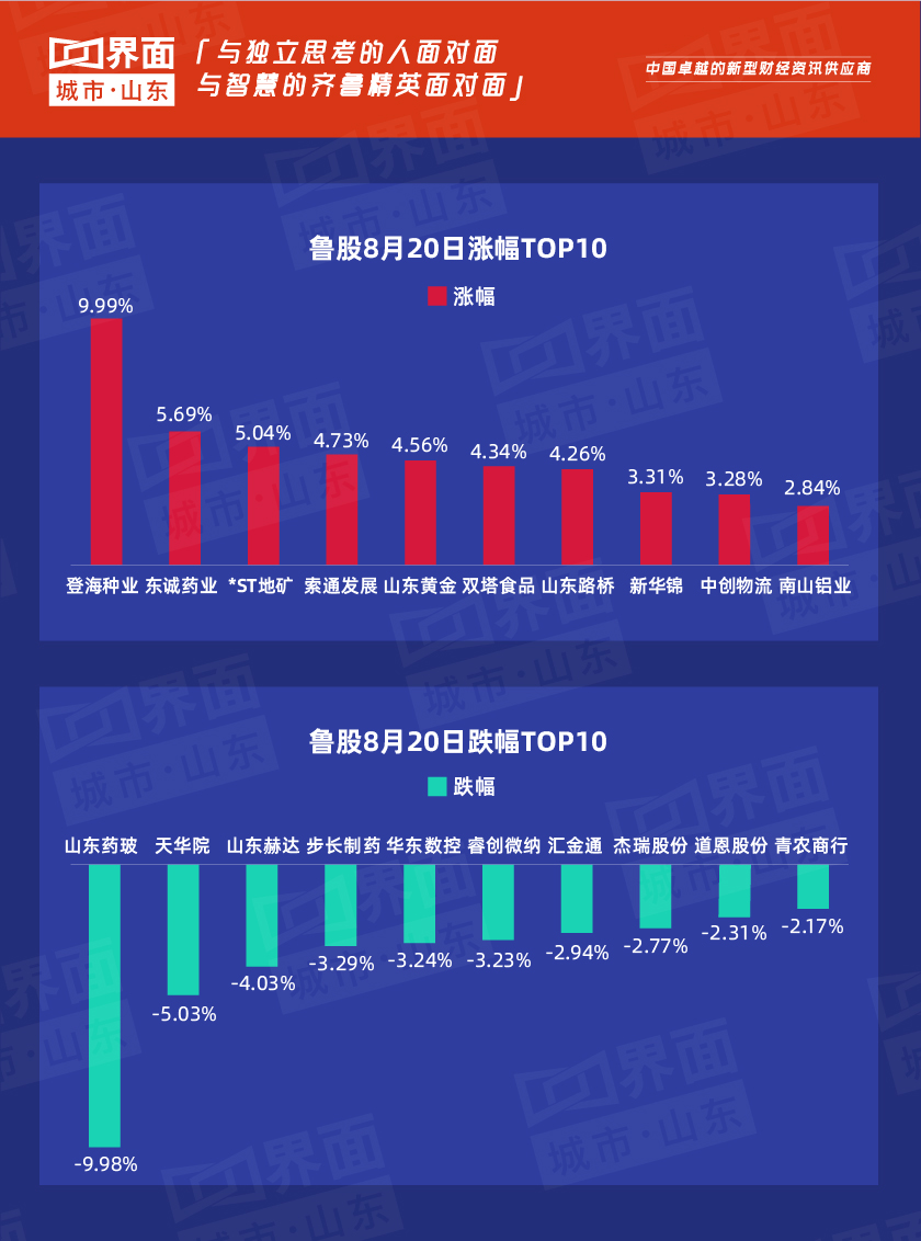 8月20日,山东省内沪深股票有77只个股上涨,113只下跌,16只与上一个交易日收盘价持平;