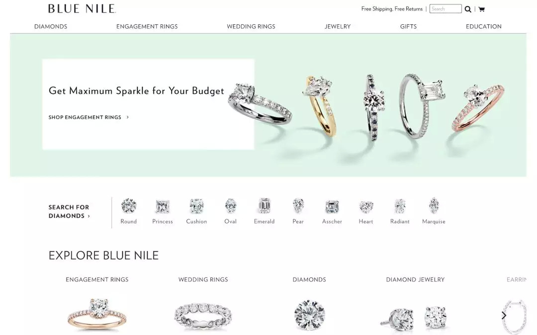 事实上,Blue Nile 的前身是美国传统珠宝零售商 Williams&Son Inc. 1995年推出的钻石电商网站。1998年,贝恩公司的管理顾问 Mark C. Vadon 在这个网站上买了一个订婚钻戒。第二年,Mark C. Vadon 筹集了600万美元收购了该网站85%的股权,对网站进行升级,并将公司名改为 Blue Nile。