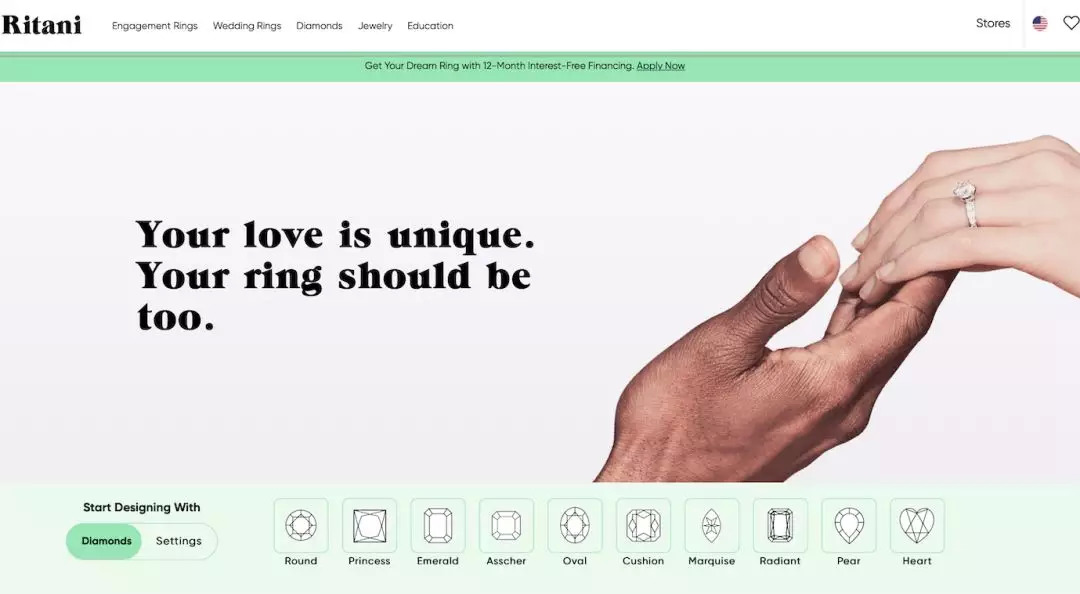 创立于2011年,Ritani 是一家专注于订婚戒指和婚嫁珠宝的高端珠宝公司,总部位于纽约。最初的 Ritani 是一家珠宝批发商,后于2012年推出了电商网站。顾客可以在线上定制一款订婚戒指,然后去临近的珠宝店试戴。2014年,Ritani 凭借其“线上购买,线下试戴”的商业模式,入选《福布斯》评委“美国最具前景的公司”榜单。