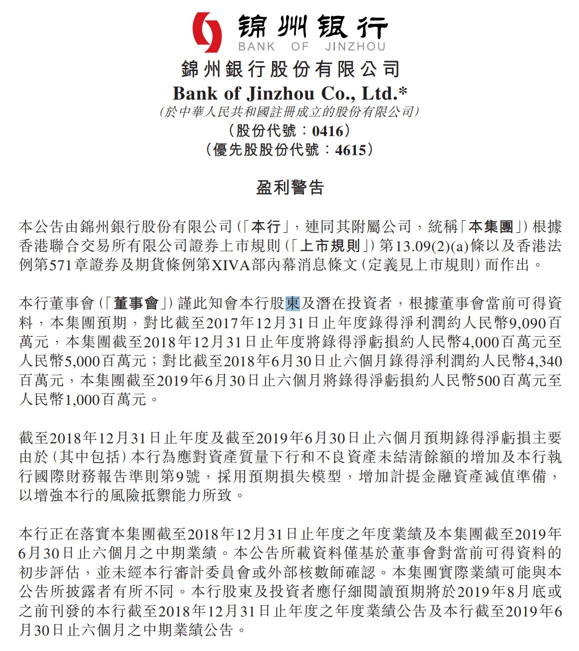 公告称,截至2018年12月31日年度及截至2019年6月30日六个月预期录得净亏损,主要由于该行为应对资产质量下行和不良资产未结清余额的增加及该行执行国际财务报告准则第9号,采用预期损失模型,增加计提金融资产减值准备,以增强该行的风险抵御能力所致。