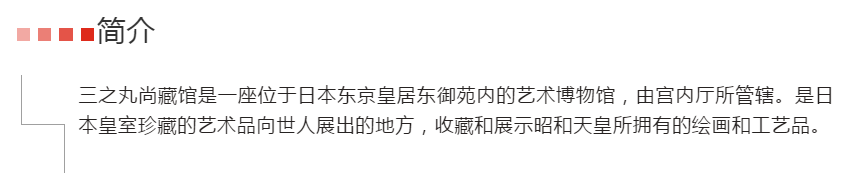 1989年1月7日,昭和天皇逝世,日本政府根据皇室经济法,将“三神器”、历代天皇的肖像及宸笔、皇室仪式中使用的屏风与刀剑类、以及与皇室有深切关连的物品,将此类型“御物”归为皇室的私有财产。除上述外的6000多件绘画、书、工艺品类,皇室将其全部捐赠给国家,“三之丸尚藏馆”就是皇室捐赠国库历代珍藏艺术品的保存、管理、调查研究及展览的机构场所,并于1993年(平成5年),正式开放。