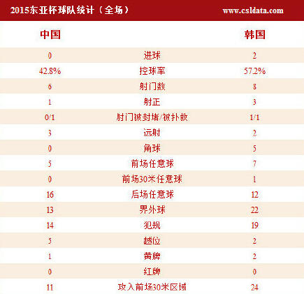 据赛后的技术统计显示,90分钟战罢,国足仅有一脚射门命中目标,没有获得哪怕一次角球,且在控球率、射门数、任意球数等数据上全面处于下风。攻入前场30米区域的次数只有11次,不足韩国队24次的一半。