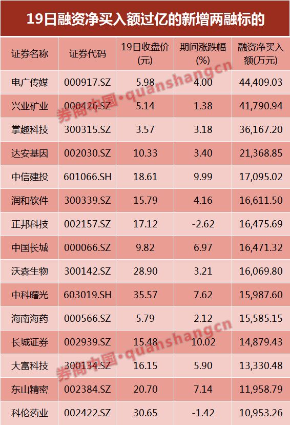 值得一提的是,券商股中信建投和长城证券作为两融新增标的,19日的融资净买入额分别为为1.7亿元和1.49亿元,当天两只个股均涨停。