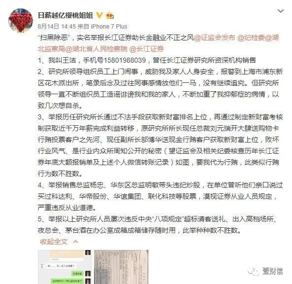 屋漏偏逢连夜雨,8月14日,新浪微博上一个叫“日薪越亿樱桃姐姐”的账号,自称是长江证券前员工王洁,实名举报长江证券:“研究所原所长现任总裁刘元瑞大肆送购物卡行贿投票客户、现任副所长邬博华送现金行贿客户获取新财富上位”;“销售总监杨忠、华东区总监明敏带头违纪炒股”;“研究所人员屡次违反中央‘八项规定’”等。