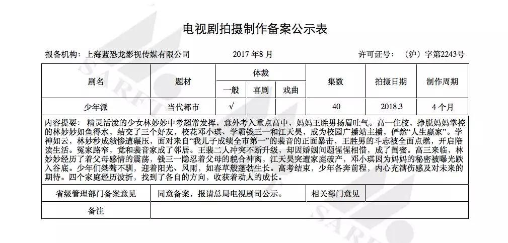 根据广电总局备案资料显示。《小欢喜》是2017年1月通过备案的,而《少年派》则是在2017年8月才通过备案的。