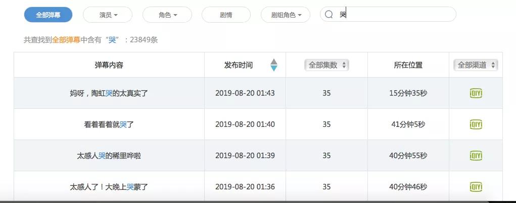 根据云合数据显示,“哭”“感动”这样的词眼已经成为了弹幕高频词汇,其中包含“哭”的弹幕条数高达23849条,包含“感动”的弹幕条数为4718条。