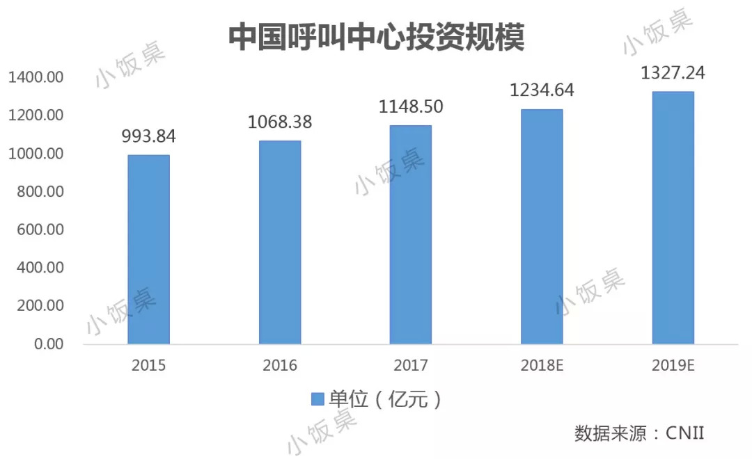 中国产业信息网的数据显示,预计2019年中国的客服行业总规模为2100多亿元,近年来一直处于增长通道,其中呼叫中心为1327亿元,在线客服为788亿元。