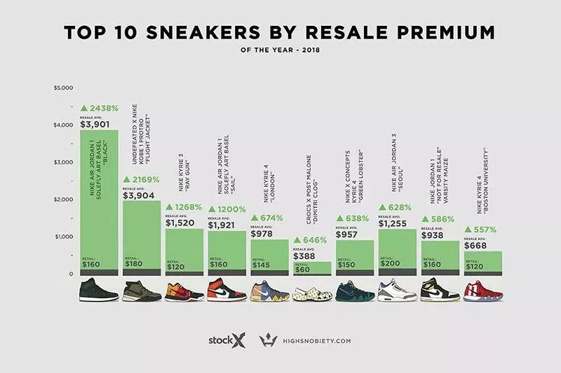 根据国外球鞋平台StockX公布的数据,2018年最贵的十双球鞋,二级市场价格区间在1430美元到3904美元间,最高涨幅达到惊人的2169%。各种重磅联名、超限定和全新科技均在其中。