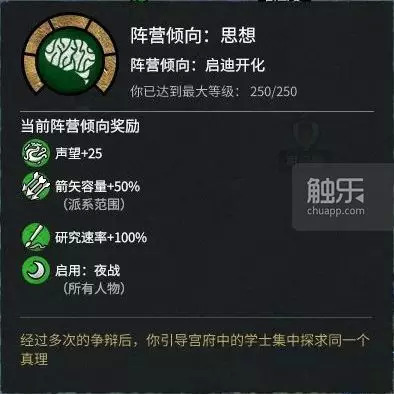 4种阵营倾向中,每一种倾向都有5个阶段,不同倾向提供的加成效果会影响到玩家的玩法选择以及最终的游戏结局。显然,这个设计脱胎于《全面战争:战锤》中诺斯卡派系的四神信仰,不同的是,四神信仰主要以战争手段来增加崇拜程度,《八王之乱》的阵营倾向度则主要由事件来决定;CA试图用贯穿整局游戏的事件来对玩家进行引导,这确实是更为符合本作历史背景的想法。