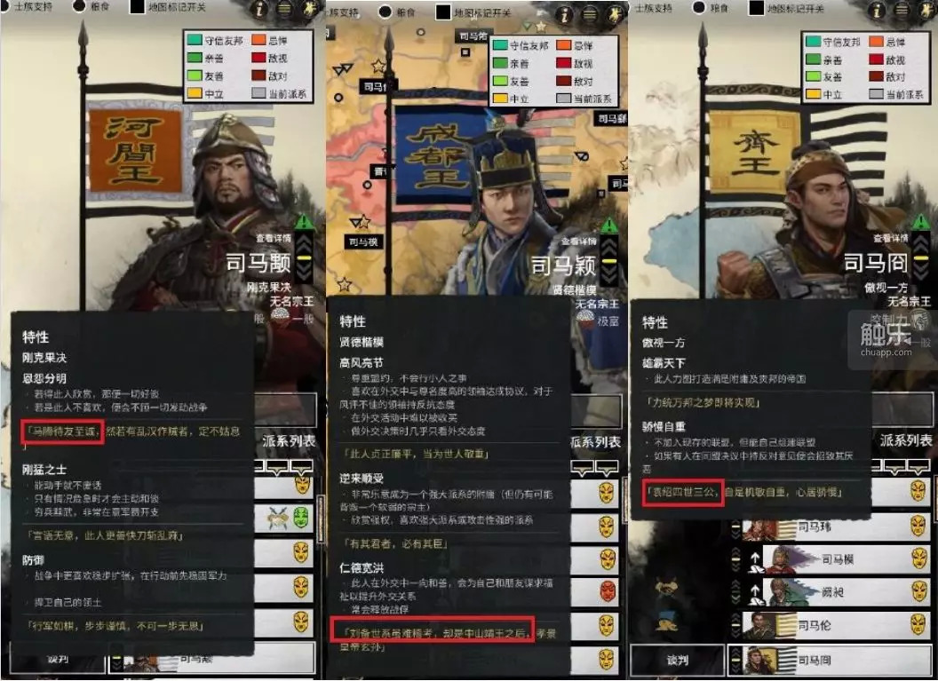 独立势力都如此敷衍,武将自然是更加随意,除了成都王司马颖开局拥有3个史实人物陆机、卢志、石超之外,其余可选势力都只有一到两个史实武将,比如长沙王司马乂拥有的唯一一个史实武将是他担任骠骑将军时的参军皇甫商,而骠骑将军府长史顾荣、司马刁协、从事中郎苟晞、主簿祖逖等人都在游戏中消失了。某种意义上来说,这个DLC可以称得上是名副其实,因为CA真的只做了八王,游戏里充斥着随机大众脸角色和不知道来自哪个世界的势力,代入感极差,几乎可以当作是一个架空剧本。