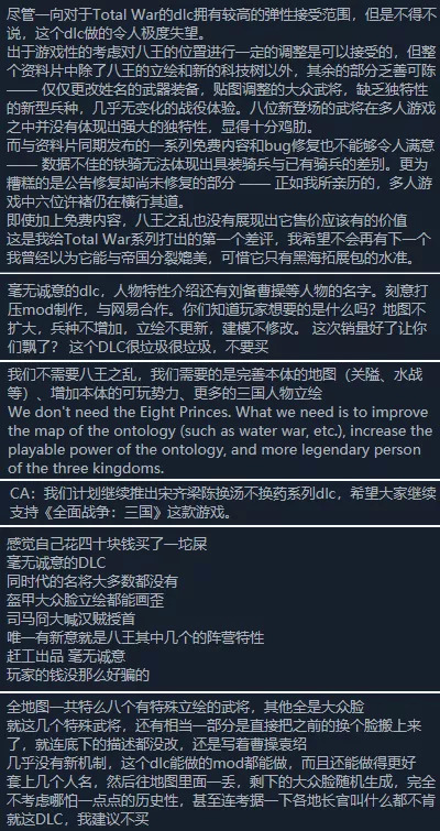 《全面战争:三国》是一款非常棒的游戏,但它仍然存在大量问题需要解决;选择中国历史文化题材是一个非常正确的决定,而中国玩家也已经给了他们足够多的回报。希望CA能想明白,中国玩家支持他们,是因为他们用中国历史文化做出了一款好游戏。如果把这种认可当作只要随随便便喊一声“我爱中国”,就能让中国玩家感恩戴德,然后顺理成章开始“恰烂钱”,那可实在是令人遗憾。