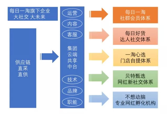 整个每日一淘已经构建了一个完整的大社交体系,这些前端业务在中台会有统一的运营、统一的内容、统一的客服和技术、品牌,以更加智能的方式对网红进行支持。