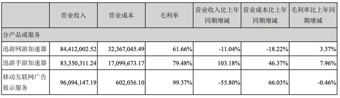 报告期内,迅游网游加速器营收8441万元,同比下滑11.04%;迅游手游加速器营收8335万元,同比增长103.18%。移动互联网广告展示服务业务营收9609万元,同比下滑55.08%。