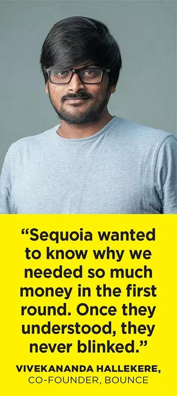 FreeCharge并非个例。Bounce的联合创始人兼首席执行官Vivekananda Hallekere表示,红杉资本不是小气的经营者。在一轮900万美元的融资轮中,红杉资本投入450万美元,当时Bounce只有一辆无桩踏板车来展示其全部价值。“我们从没有就100万美元、20%股份之类的事情与红杉进行对话。他们只是想知道为什么我们在第一轮需要这么多钱。他们要追究‘为什么',一旦他们弄明白了,不眨眼就会投资,” Hallekere说。