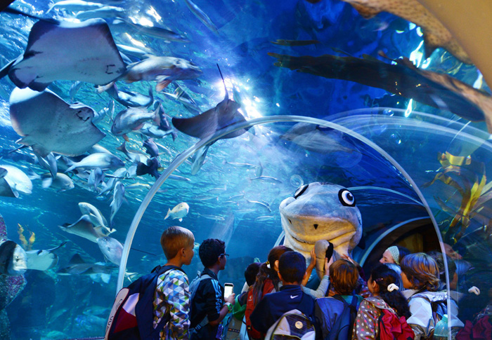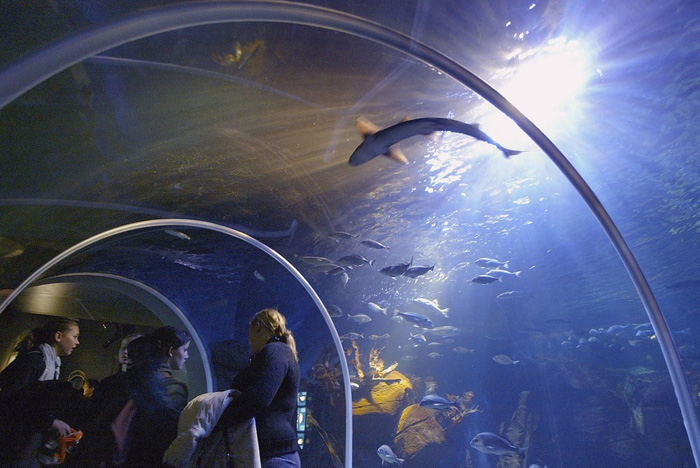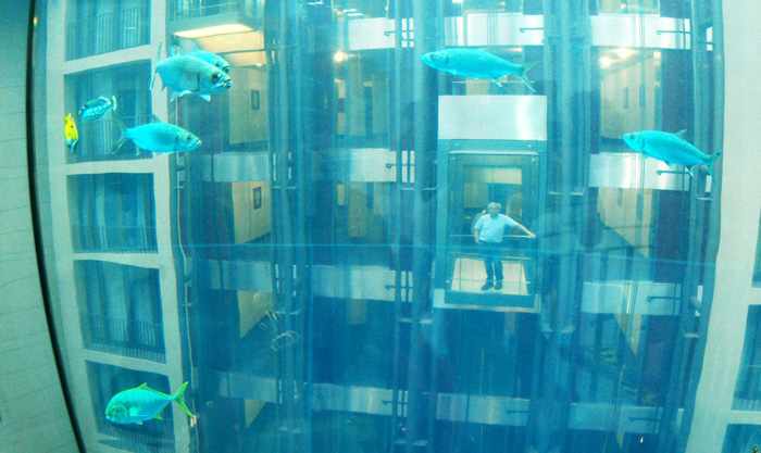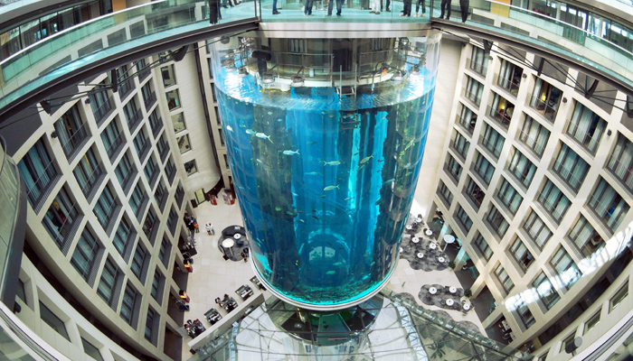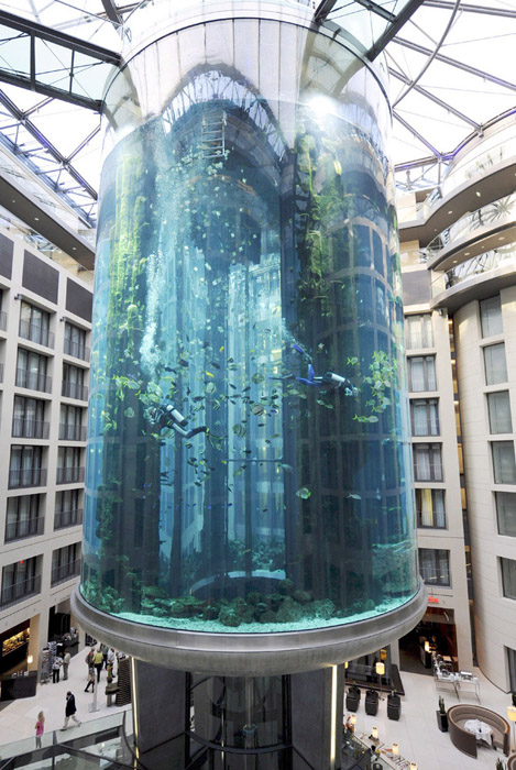 柏林的AquaDom水族馆可能会满足小朋友关于海底童话的想象。它位于雷迪森蓝光酒店(Radisson Blu hotel)内,有82英尺(25米)高,是个顶天立地的玻璃水槽。轴心是一部观光电梯,平日里有1500多条鱼绕着它游来游去。
