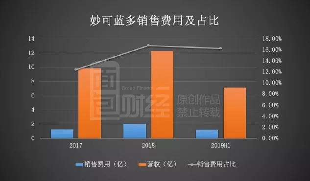 财报数据显示,妙可蓝多在2017、2018以及2019半年度的销售费用支出分别为1.22亿、2.05亿以及1.16亿,占营收的比例处于相对高位。