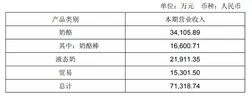 从中报披露的营收构成来看,奶酪、液态奶、贸易业务的营收为3.41亿、2.19亿以及1.53亿,分别占比47.83%、30.72%以及21.46%。