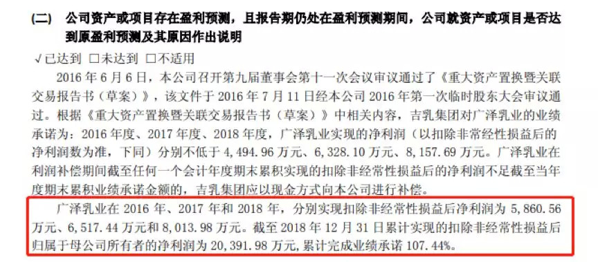 翻查相关资料发现,广泽乳业是在2016年通过资产置换的方式并入上市公司。根据当时的协议,广泽乳业在2016-2018年的业绩承诺(扣除非经常性损益后的净利润)分别为不低于4,494.96万、6,328.10万以及8,157.69万。