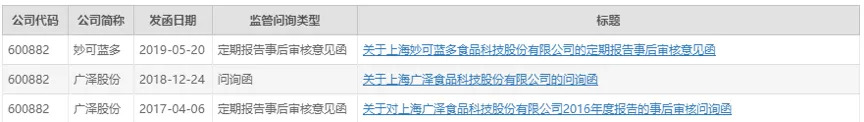 另外值得一提的是,自2016年重组并入上市公司以来,妙可蓝多(原名广泽股份)在2017-2019年期间的每年都会收到交易所意见函或问询函。