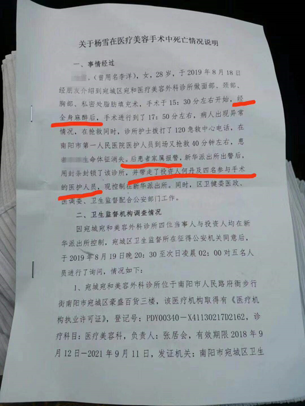 8月21日,杨某的家属从宛城区卫健委取得了一份《关于杨某在医疗美容手术中死亡情况说明》(下称《情况说明》),大致还原了事故的经过及调查进展。