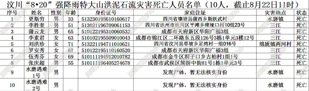 截至8月22日中午12时,汶川“8•20”强降雨特大山洪泥石流灾害共计造成10人遇难和28人失联。现将遇难和失联人员名单公布如下,希望社会各界积极与汶川县公安局联系,帮助提供所涉人员信息及线索。