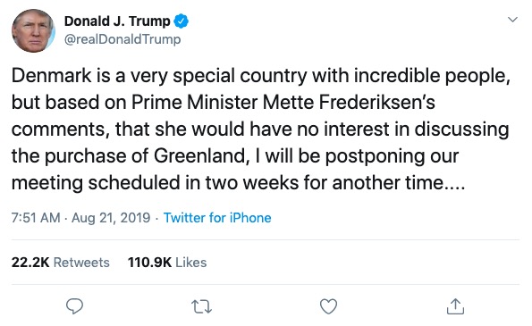 尽管特朗普此前也曾表示购买格陵兰岛不是美国要与丹麦讨论的首要问题,但丹麦的拒绝显然让他很不爽。20日,特朗普在推特上表示,由于弗雷德里克森没有兴趣讨论购买格陵兰岛的问题,他将推迟原定于两周后的会面。但有白宫官员向CNN证实,特朗普的丹麦之行已经被彻底取消,而非推迟。