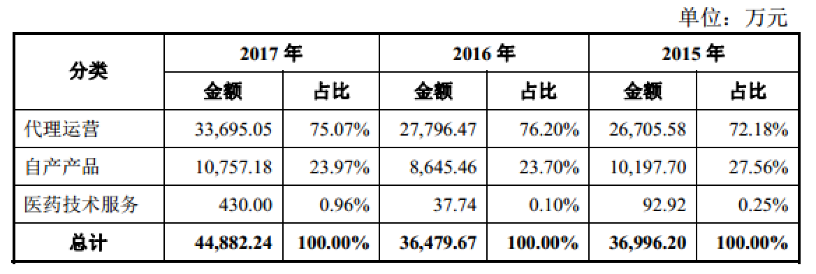由上可见,泰恩康是代理起家,代理运营的收入占比超过了7成。据招股书显示,2017年代理运营收入33695.05万元,占比75.07%;23.97%为自产产品带来的收入;0.96%为医药技术服务带来的收入。在2018年年报中,泰恩康披露代理运营的收入为36746.43万元,占营收总数的70.85%,仍然占比很高。