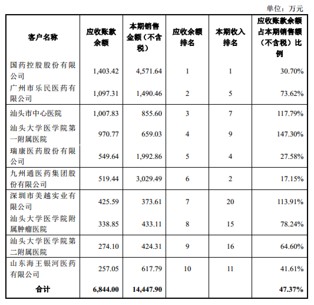 从2017年的名单来看,应收账款前10客户中,汕头市中心医院、汕头大学医学院第一附属医院、深圳市美越实业有限公司的应收账款余额,占当期销售额(不含税)的比例均超过了100%;另有广州市乐民医药有限公司、汕头大学医学院附属肿瘤医院、汕头大学医学院第二附属医院的应收账款约占销售比超过了60%。前10应收账款客户在2017年末的应收账款余额合计为6844万元,整体占对应销售额比例的47.37%。