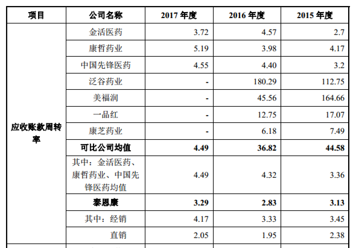 面对此种情形,泰恩康也做了多方面解释。比如结算政策,泰恩康的应收账款周转率与同行业可比公司中新三板挂牌企业泛谷药业(837090)、美福润(833784)的数据没法相比。因为这两家公司采用“先款后货”的结算政策,因此期末应收账款余额较小,应收账款周转率大幅高于其他同行业可比企业。另比如客户群体,泰恩康认为自己的医院客户受审批结算流程及社保基金拨付时间均较长的影响,回款周期与一般客户相比较长,如公司代理销售医疗器械的主要客户为医院,回款周期通常在6个月以上;连锁药店客户由于直接面对终端用户,涉及门店数量较多,日常经营所需存货规模较大,资金压力较大,且社保资金回款有一定时间周期,通常回款周期与其他客户相比较长。