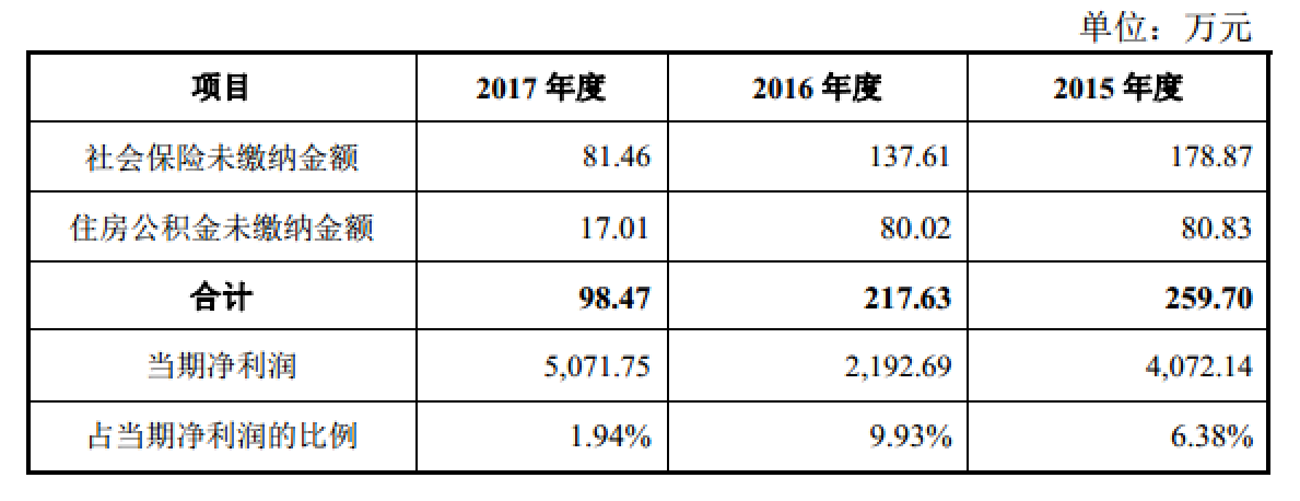 未缴纳就需要补缴。数据显示,泰恩康2015年至2017年需要补缴的社保和公积金金额分别为259.7万元、217.63万元、98.47万元,占当期净利润的比例并不高。