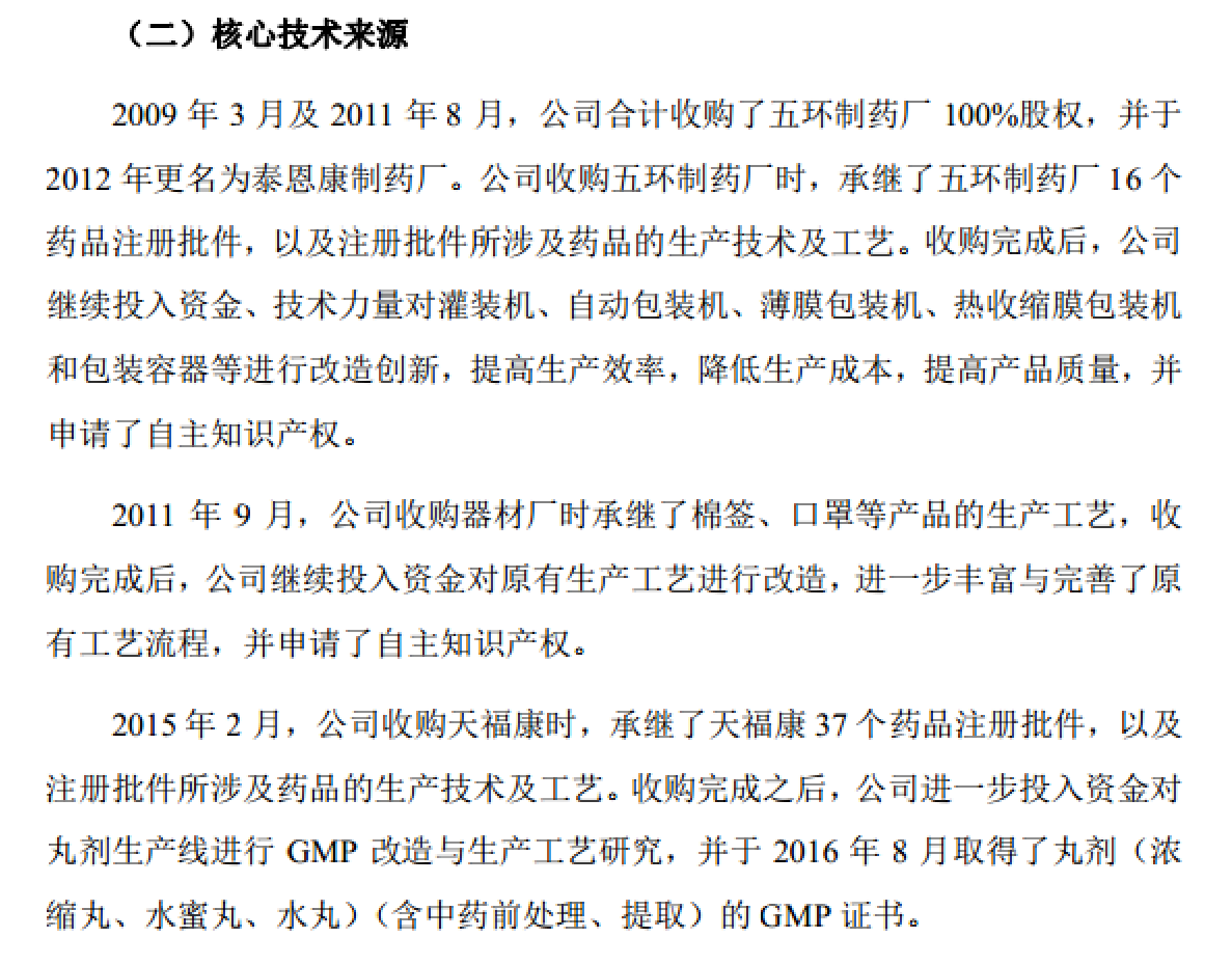 2015年2月,泰恩康又收购天福康时,承继了天福康37个药品注册批件,以及注册批件所涉及药品的生产技术及工艺,收购完成之后,公司进一步投入资金对丸剂生产线进行GMP改造与生产工艺研究,并于2016年8月取得了丸剂(浓缩丸、水蜜丸、水丸)(含中药前处理、提取)的GMP证书。