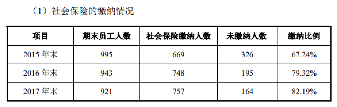 另从招股书上了解到,泰恩康的员工里,没缴纳社保的不在少数。比如2015年的995名员中就有326人没缴纳,占比3成以上。而在2017年里,也有164人没有缴纳社保。