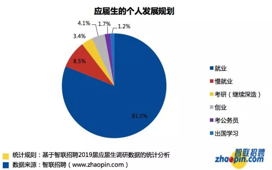 智联关于2019年应届毕业生求职的一项调研显示,应届大学毕业生选择就业的人群占比81%,选择慢就业的人群占比8.5%,选择国内或国外继续深造占比4.6%,选择创业的应届生占比4.1%,有1.7%选择考取公务员。