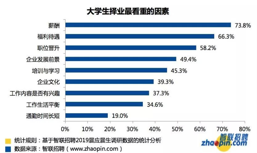 其次是发展空间,58.2%的应届生择业看重职位晋升,49.4%的应届生择业看重“企业发展前景”。更多的毕业生不再“既要面包又要诗和远方”,人生规划更务实专注。